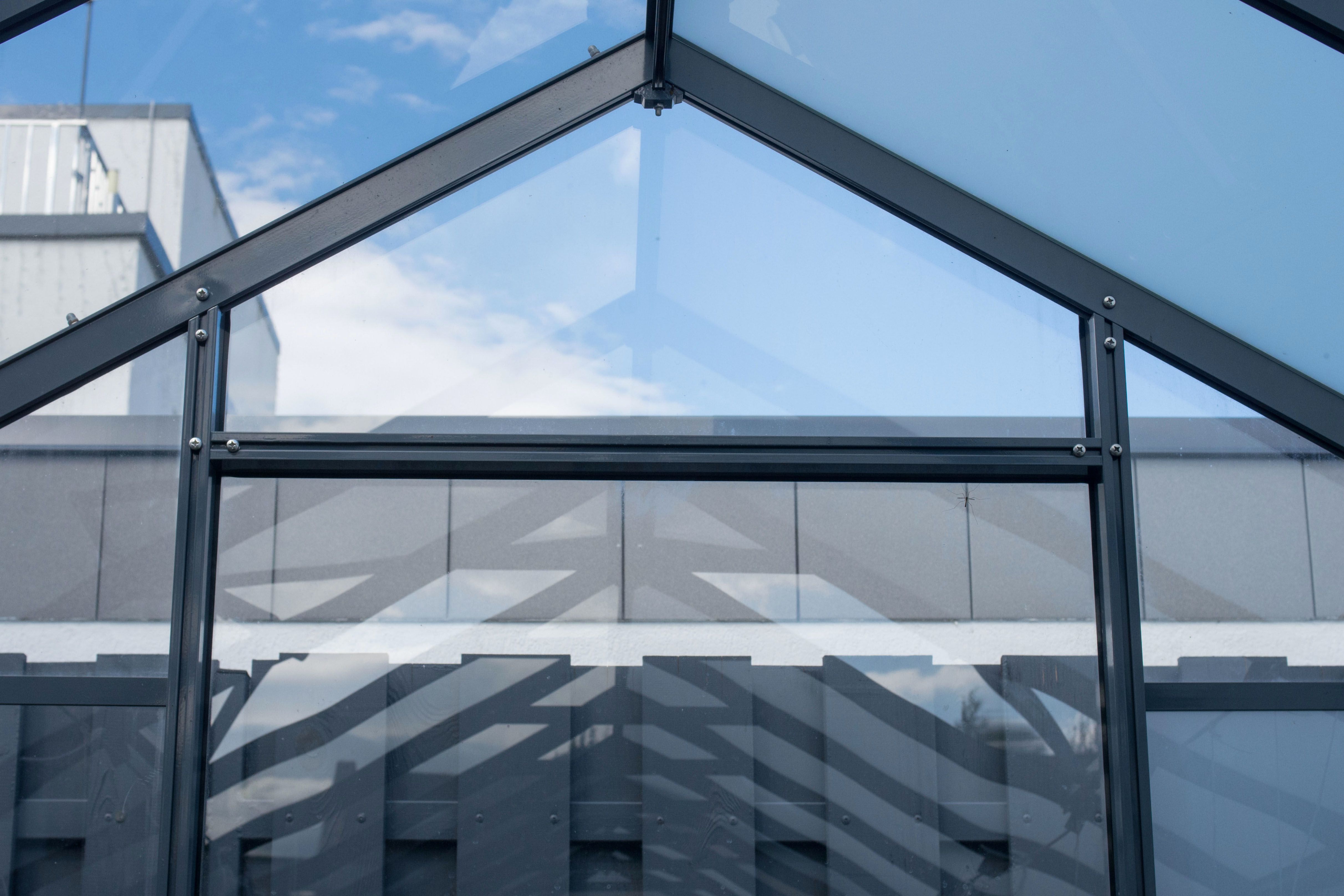 Стеклянное покрытие создаёт панорамное остекление и много прозрачности, благодаря чему внутри формируется ощущение открытого пространства и светопрозрачная крыша наполняет теплицу естественным светом.